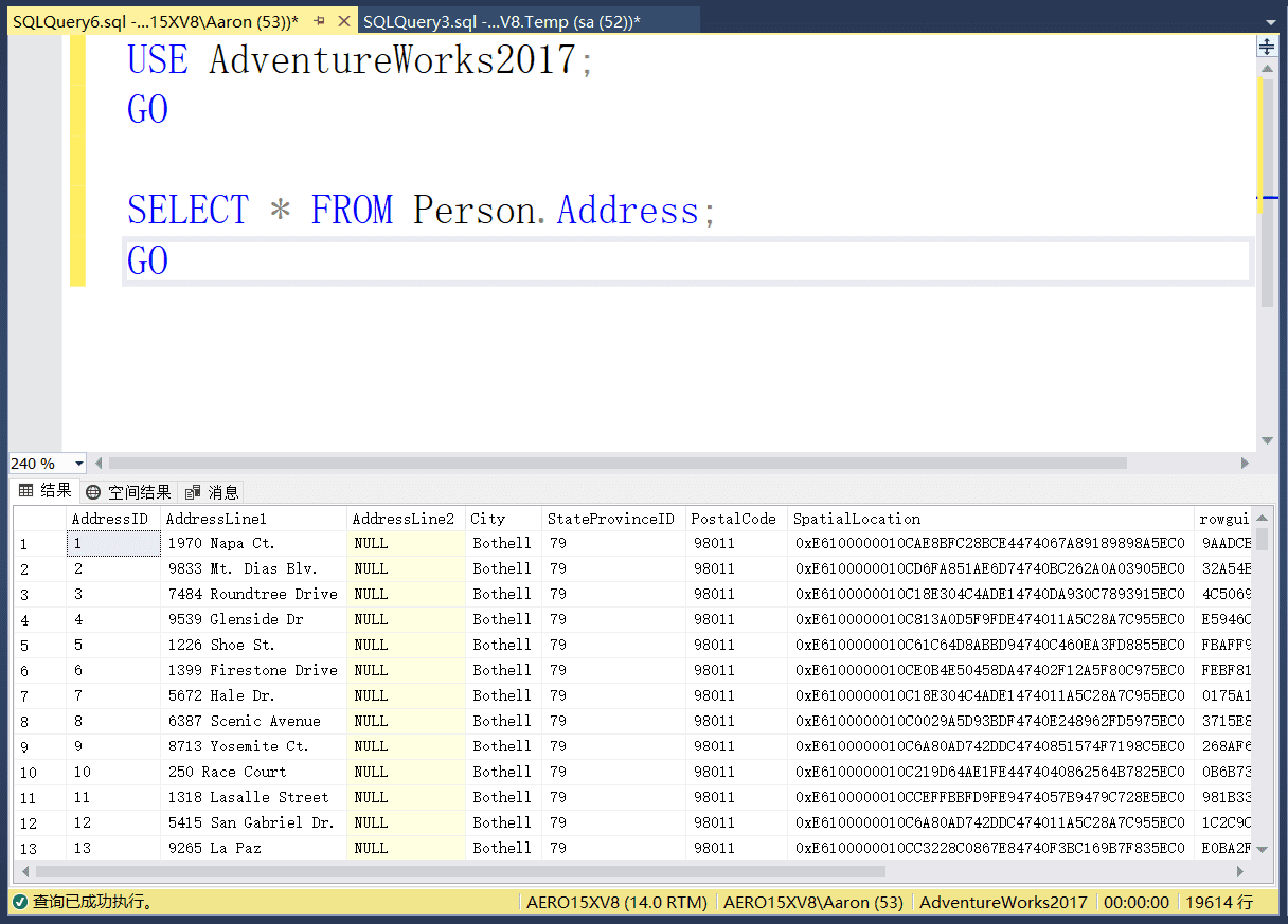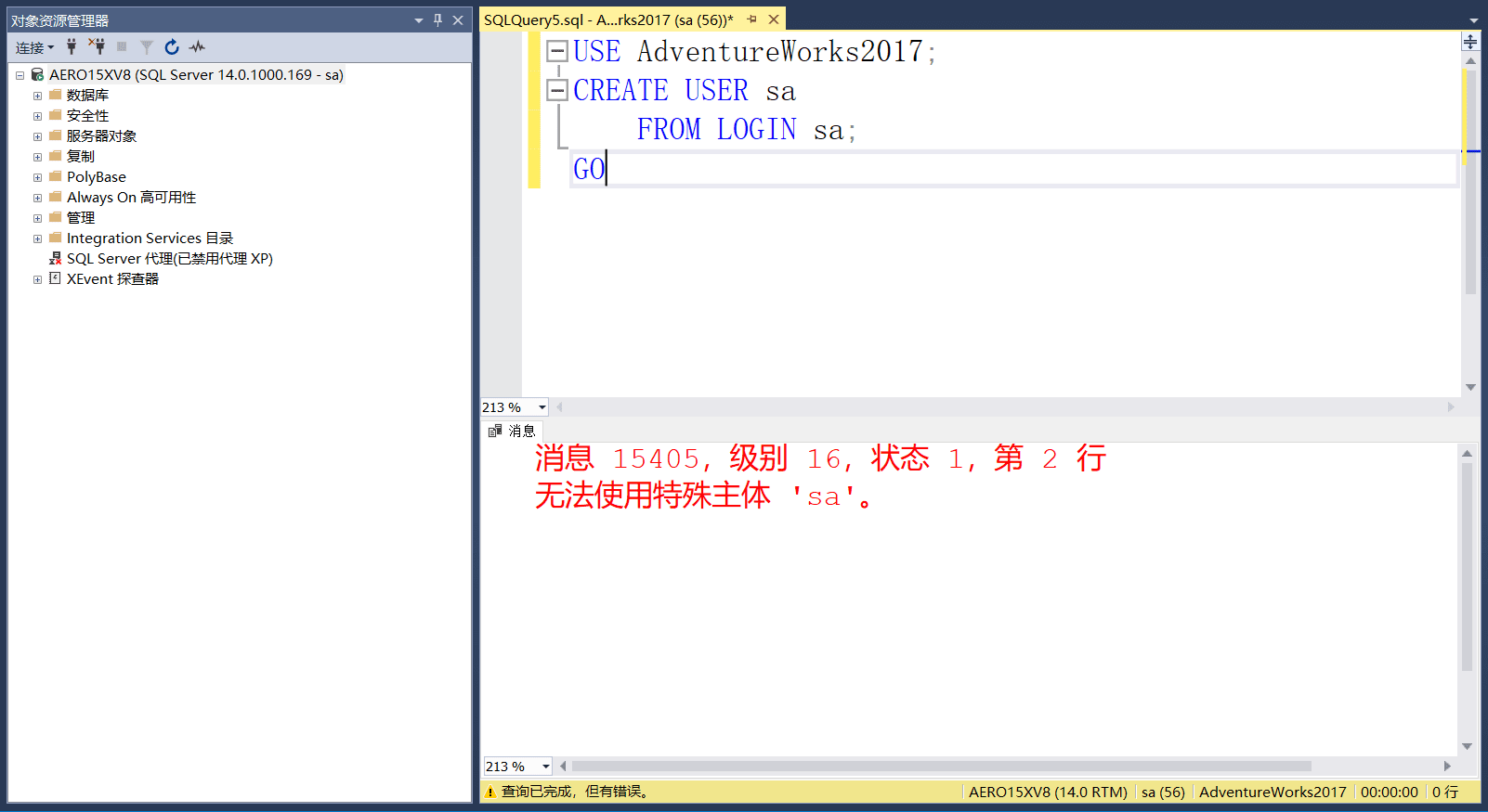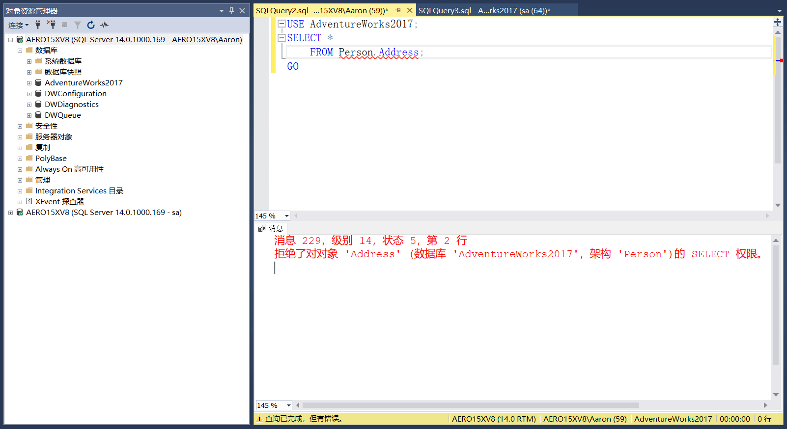 发现确实映射到了数据库AdventureWorks2017,至于为什么没有SELECT操作权限,会在后面数据库角色说明.