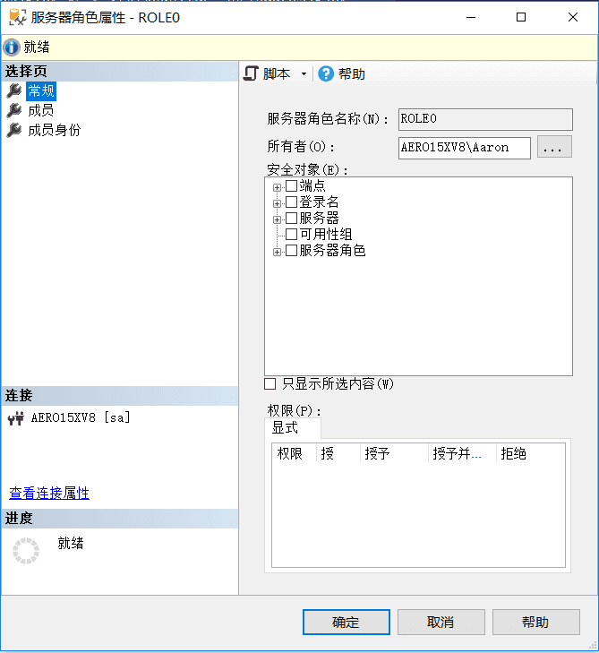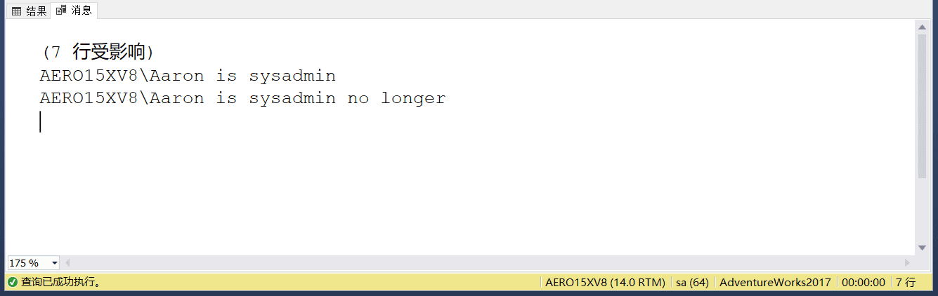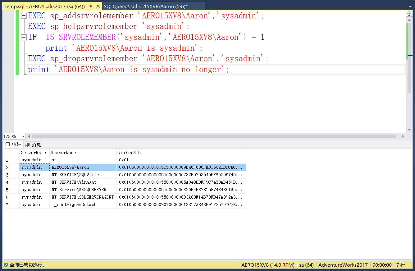 EXEC sp_addsrvrolemember 'AERO15XV8\Aaron','sysadmin';--将登录名加入到系统管理员中;