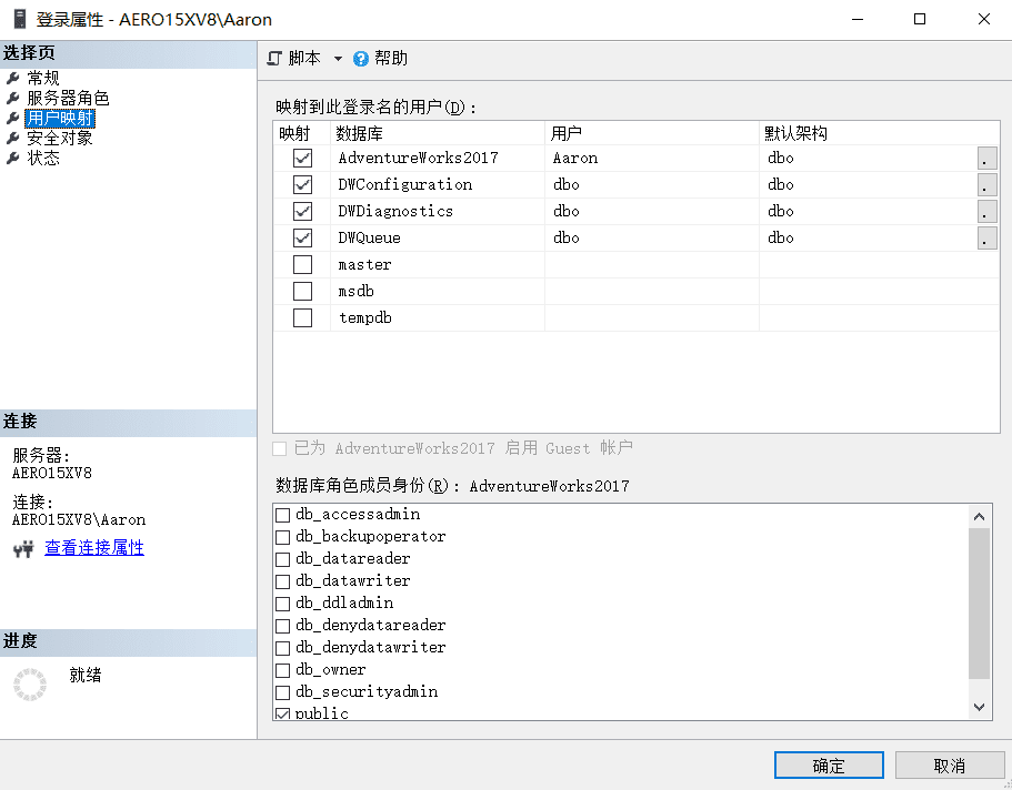 可以看到此时登录名在AdventureWorks下的映射用户Aaron继承了public和db_owner角色:
