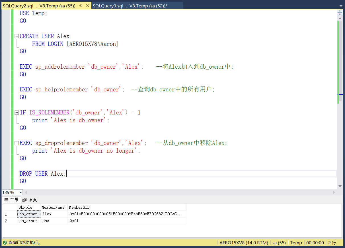 EXEC sp_addrolemember 'db_owner','Alex';--将Alex加入到db_owner中;