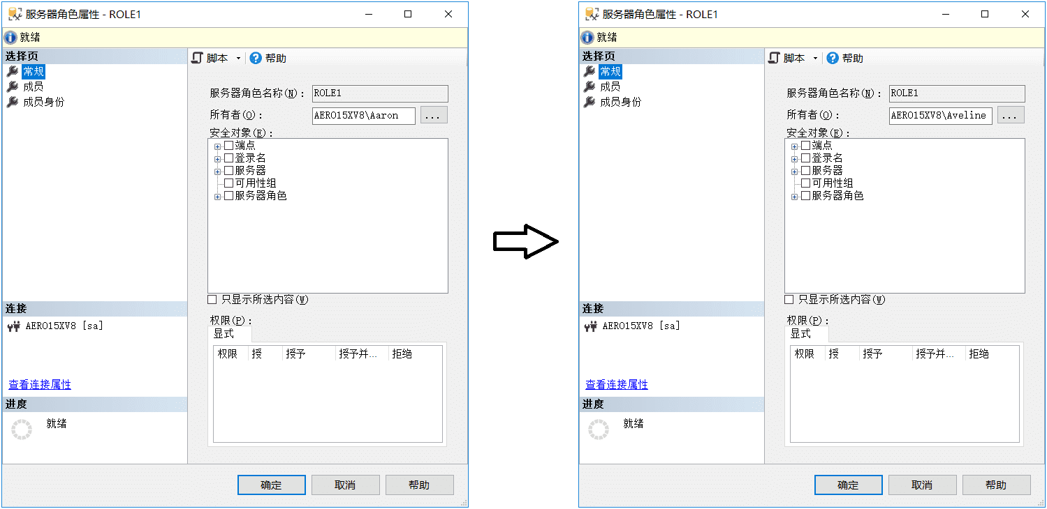 ALTER AUTHORIZATION ON SERVER ROLE::ROLE1 TO [AERO15XV8\Aveline];--更改角色所有者;
