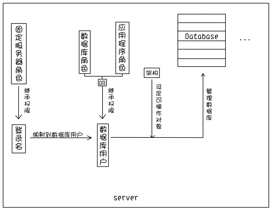 - 实际用户 -> 登录名 + 角色 -> 数据库用户 + 角色 -> 数据库