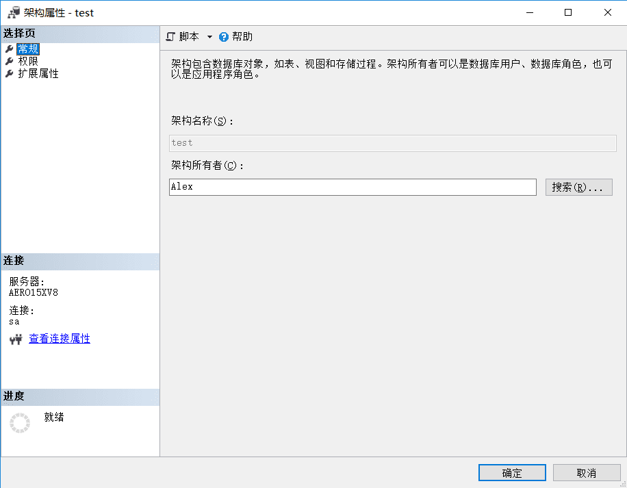 观察上面的[AERO5XV8\Aaron]的用户映射图片,你会发现一个默认架构的选项,这其实指定的是用户拥有的数据库架构,那什么是架构呢?先定个调:架构是数据库对象的集合,它的关键词是SCHEMA.