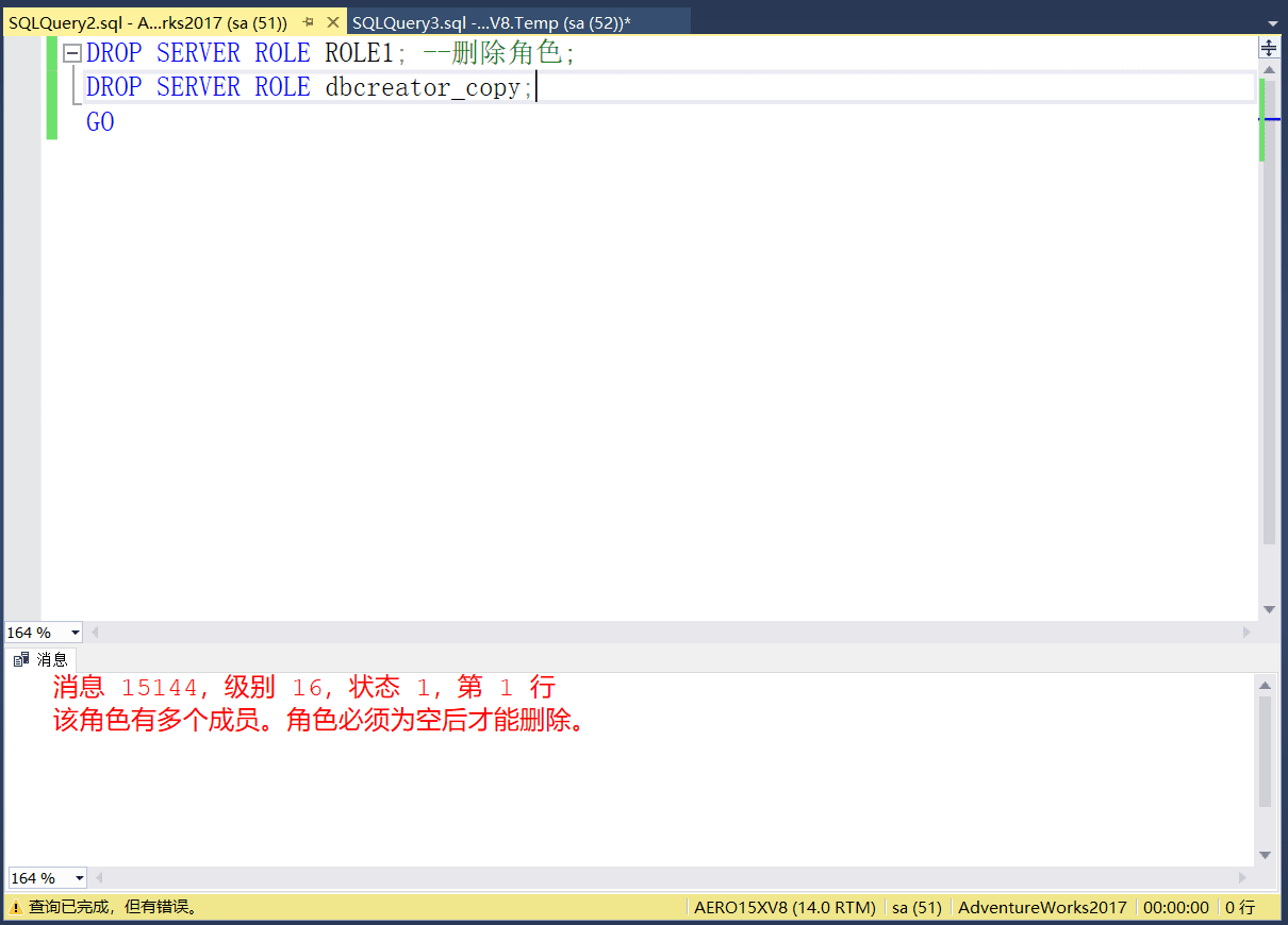 ALTER SERVER ROLE ROLE1 DROP MEMBER [AERO15XV8\Aaron];--将登录名移出角色;