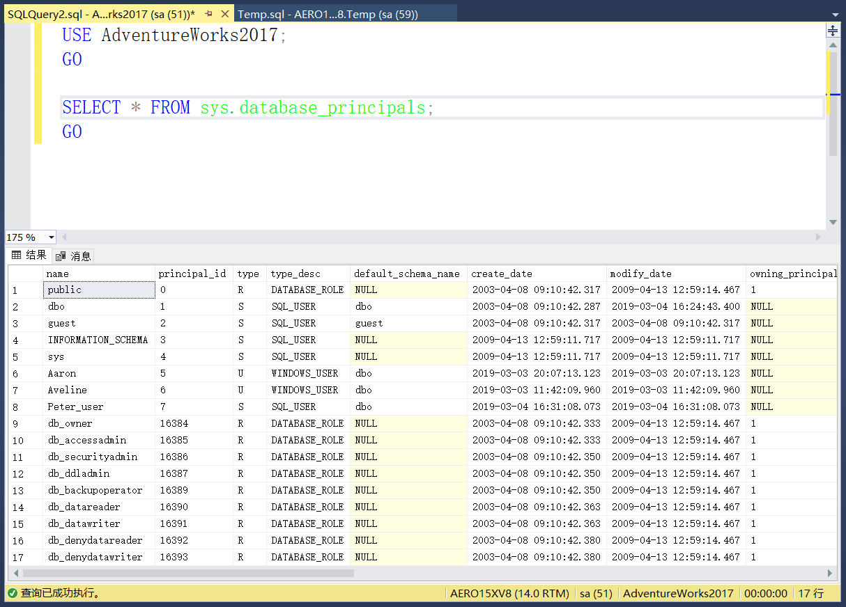 如果希望查看数据库中用户的信息,可以使用sys.database_principals目录视图.该目录视图包含了有关数据库用户的名称、ID、类型、架构、创建和最后修改日期等信息,如下: