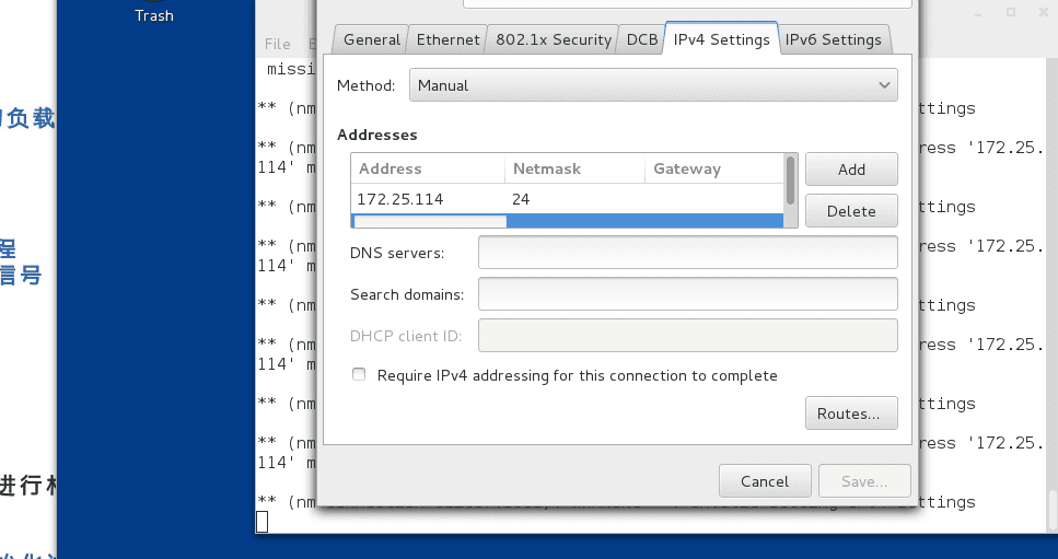 选择Device的名称eth0,选择ipv4 address输入172.252.25.–,netmask输入24,gateway点一下