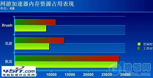测试小结:不难发现,Xrush网游加速器的整体表现要好一些,迅游紧跟其后;而傲盾的内存资源占用率则相对偏高,但它的变化状态相比前两款软件来说更稳定一些。