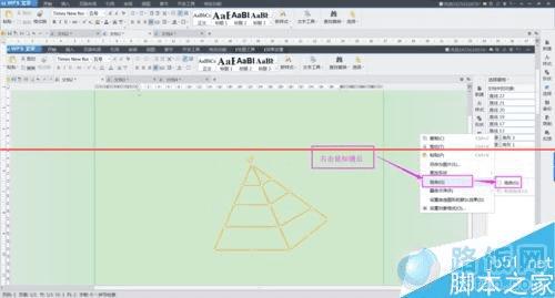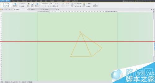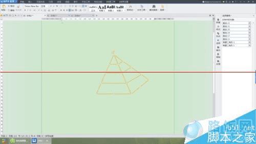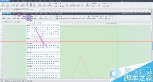 3、在菜单栏【插入】→【形状】→【线条】如下图所示,分别添加两条线条,将平面的三角形绘制成平面版的三角体。分别为正面、侧面的两个三角形添加上线条,绘制成金字塔形状,如下图所示:在这一步中要注意的就是,绘制直线!绘制直线的时候,按住Shift键,然后开始绘制即可得到真正直的线条。