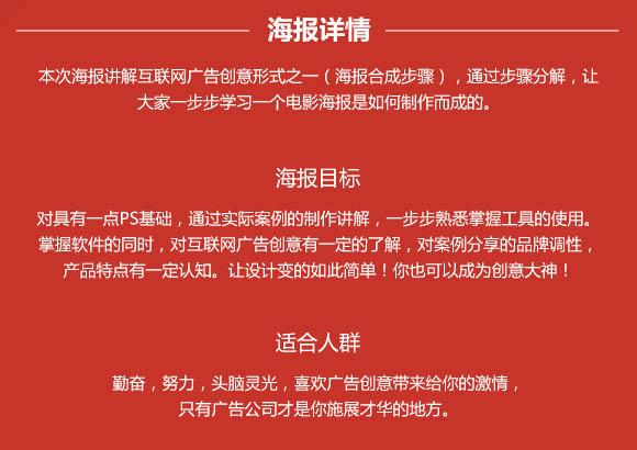 本次海报讲解互联网广告创意形式之一(海报合成步骤),通过步骤分解,让大家一步步学习一个电影海报是如何制作而成的。
