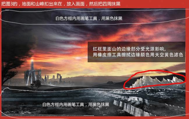 3、把图3的地面和山峰抠出来,再放入画面,然后把四周抹黑。