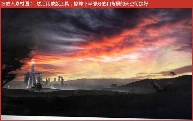 2、再放入素材图2,然后用蒙版工具,擦掉下半部分的和背景的天空衔接好。
