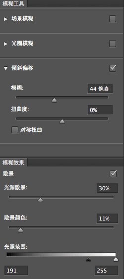 盖印图层(Ctrl+Alt+Shift+E),对盖印的新图层执行滤镜>模糊>移轴模糊。位置如下: