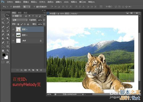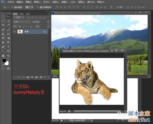 2、将大自然的图片,直接拖动要画布中;因为老虎的图片背景层较单一,这里我们选择魔棒工具,点击背景的白色,再点击属性栏中的选择—反向,使用移动工具将老虎也拖到画布中。最后关闭大自然和老虎的图片。
