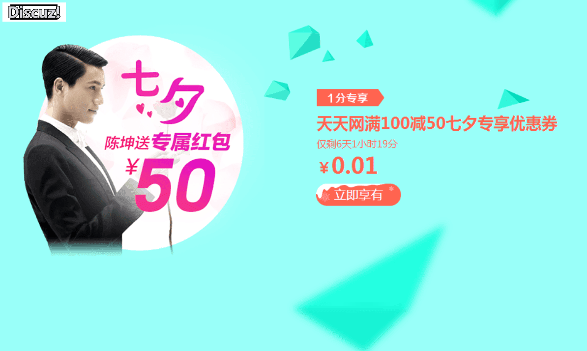 06.一分钱专享天天网满100减50七夕专享优惠券,