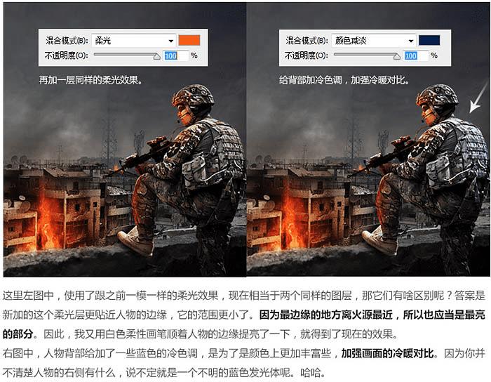 5、给人物的受光面添加环境光,这里提供的对比是为了让大家看到使用柔光之后的状态,可能右边使用了柔光之后效果并不是很明显,但是这只是第一步,只是给受光面一个大致的暖调,打光的过程很多情况下并不是一步就完成的。