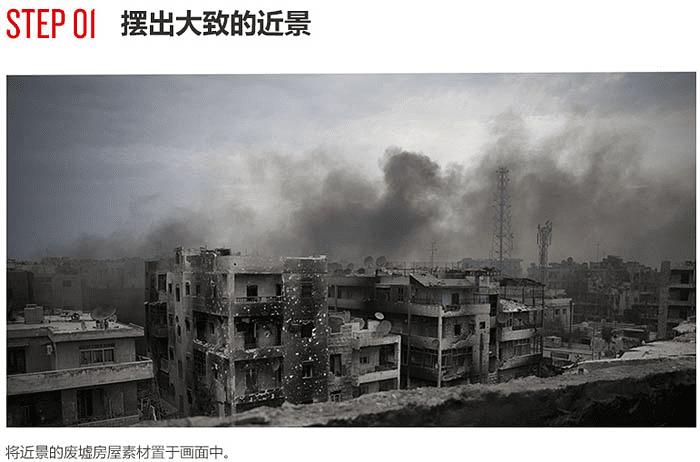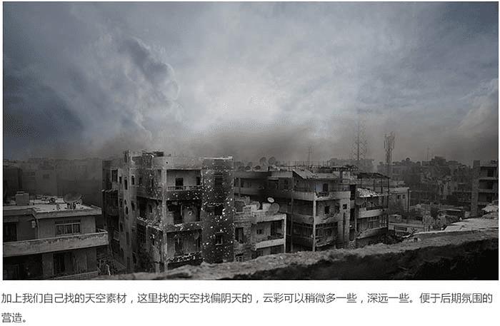 1、将近景的废墟房屋素材置于画面中。