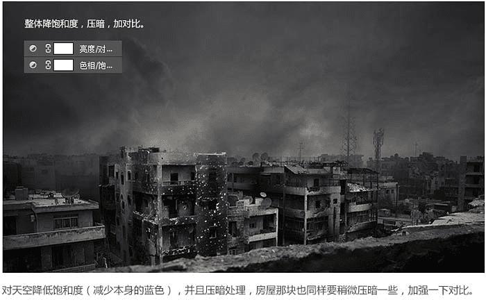 4、对天空降低饱和度(减少本身的蓝色),并且压暗处理,房屋那块也同样稍微压暗一些,加强一下对比。