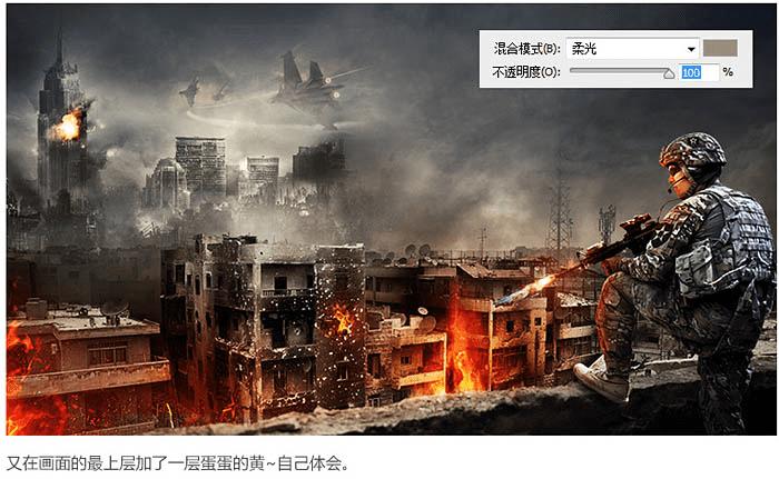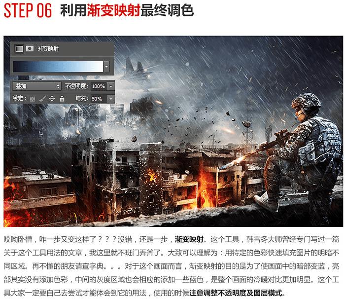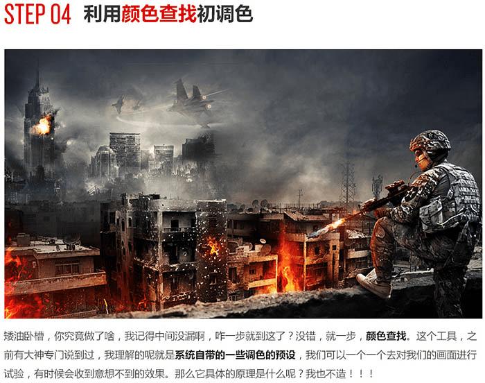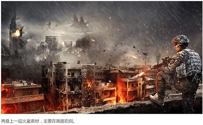 怎么样用ps合成残酷的战争电影海报?(2) 来源:www.45fan.com 2015-09-27 15:45:33 三、对远景进行处理: 1、置入远景素材。 2、擦掉多余部分,并且降低饱和度,清除画面中不和谐的天蓝色,稍微加强一下对比度。 3、给远处的高楼添加爆炸效果。 4、给画面加入战斗机。 四、利用颜色查找初调色。 五、氛围营造: 六、利用渐变映射最终调色: 最终效果: 共2页: 上一页12下一页 推荐阅读 如何使用photoshop制作2寸照片? 如何在ps中图层样式制作金属镜面反射效果 如何在ps中制作喷溅血迹立体火焰字? 如何在ps中将树林婚片打造甜美的逆光青红 怎么样使用ps绘制漂亮高格调的立体拟物风 怎么样使用ps合成创意的暗黑风格骷髅女孩 如何使用ps合成简约大气温馨的家居主题海 怎么样使用PS合成制作出蜗牛背上的梦幻房 如何使用ps合成魔幻的美女和狮子海报? 如何使用PS合成制作出在云海中的泛舟的美