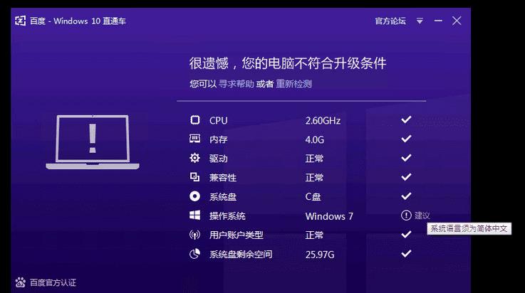 您如果需要通过百度直通车升级到Windows 10,当前的操作系统语言版本必须为简体中文。 如果是其他语言,则无法通过检测。您的系统如果是通过在非简体中文系统上安装简体中文语言包实现简体中文界面,