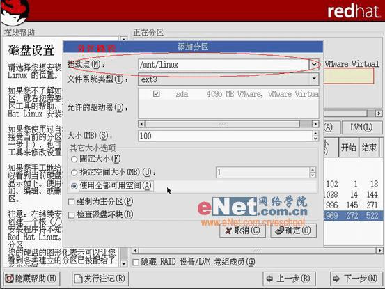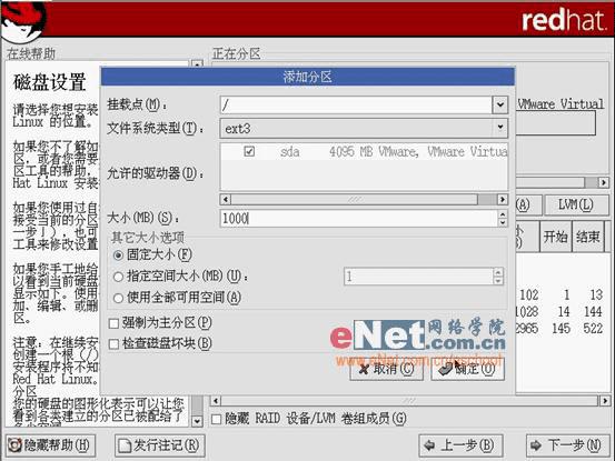 第十一步:建立一个Linux 下的根分区,挂载点处为“/”,大小根据硬盘分区实际大小自己意愿填写。