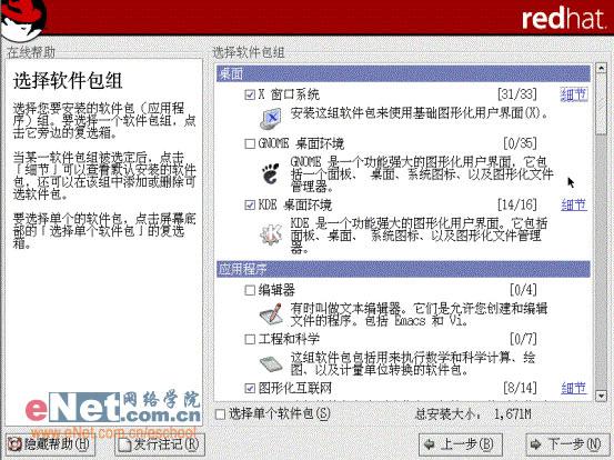 第十七步:选择软件包组。Linux给我们提供了多个现成的软件包,包括:窗口系统,桌面环境,文本编辑器,科学计算器,图形化文件管理器等多种应用程序。你需要什么软件包只要在其前面勾取即可。方便实用,功能强大。