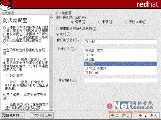 第十四步:防火墙配置。这里选择默认的就好,当然也可以选择“无防火墙”。如果设置成“高级”会限制大部分数据包,网页也经常会有打不开等现象。