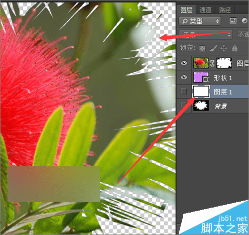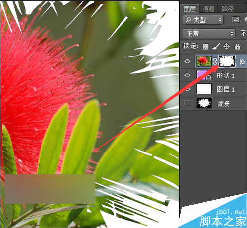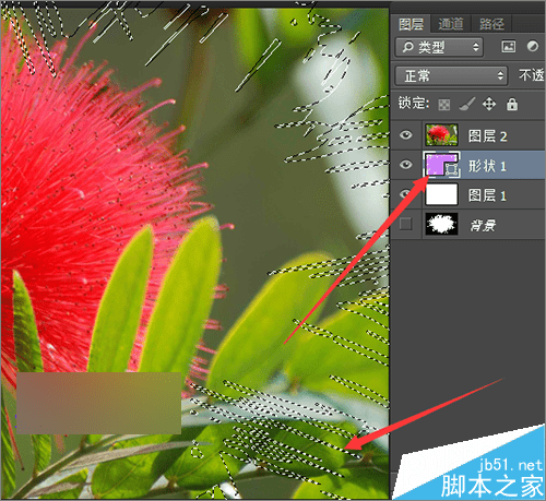 10、点击刚才的形状图层,在它的上面做出选区。然后再回到上面图片的图层上面,点击下面的蒙板。把上面的图层添加一个蒙板。