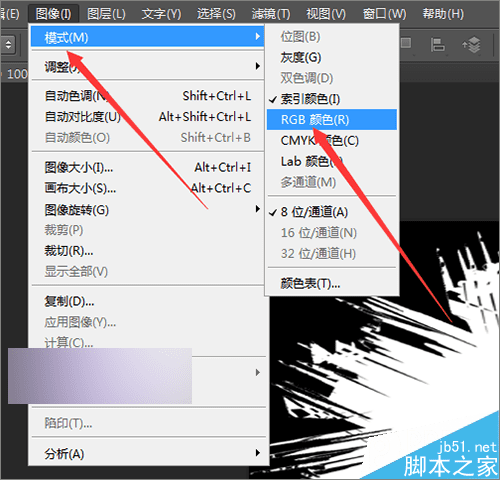 2、当把这样的图片在ps软件中打开的时候,有时,需要注意一下它的图片模式。如果在图层上显示的是索引的话,就需要把它的模式进行一个更改。在图像菜单下面点击模式,把它的模式选择为RGB.
