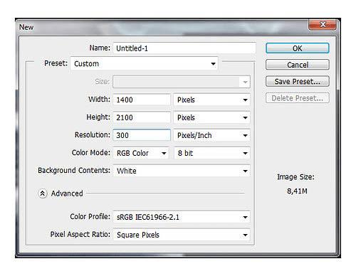 1、打开Adobe Photoshop和去文件>新建(或按下控制-N键盘上),以创建一个新文档。设置宽度为1400像素,高度为2100像素和分辨率为300。