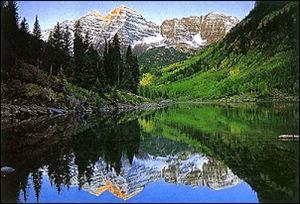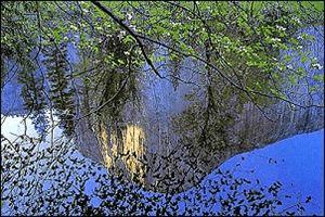 倒影可以为画面增添感染力并带来视觉快感:由于景物倒影可以使风景的部分图案得以延伸或重复,它们能扩大风光影像的表现力与表现范围。倒影本身还可以为景色增加宁静感。捕捉倒影的最佳时机是在日出时分(临近日出之前,日出期间和日出之后不久),那时周围的气氛平静。其次是在日落时分拍摄。最富有戏剧性的倒影经常是出现在像镜子一样的水面上。小水洼,如池塘、水坑、河水退后形成的死水和小的湖泊,有可能提供拍到理想倒影的好地方。在拍摄之前就应当观察好这些地方。我通常利用中午的时间来进行这种勘察工作,设法在较小的地方选择两个可以放下三脚架的拍摄地点,以便我能在同一拍摄期间捕捉到两种不同的倒影。不必去寻找能把整个风景都映现出来的拍摄地点。甚至一片连绵的静水也可以充分映现出景色,为画面增添一块非常有趣的部分。有时我穿着高统防水胶靴,这样我可以在水中寻找最好的拍摄角度。