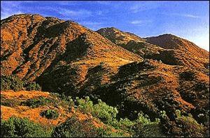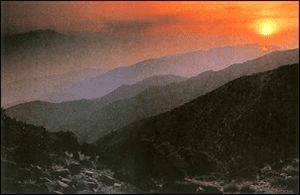拍摄数据为;佳能EOS A2相机,28-105毫米f/3.5-4.5镜头调至105毫米一端,使用富土维尔维亚胶片。作者站在长有短叶丝兰树的名胜古迹区,使用TTL点测光表对准加利福尼亚州的圣贾辛托山的背阴部位进行测光,显示手动曝光的数据为 f/22,1/2秒。作者从画面左下方至右上方加用了高坚中灰渐变滤镜,并使滤镜的角度与山脉的走向平行,以减弱太阳、天空和远处雾蒙蒙山脉的亮度。
