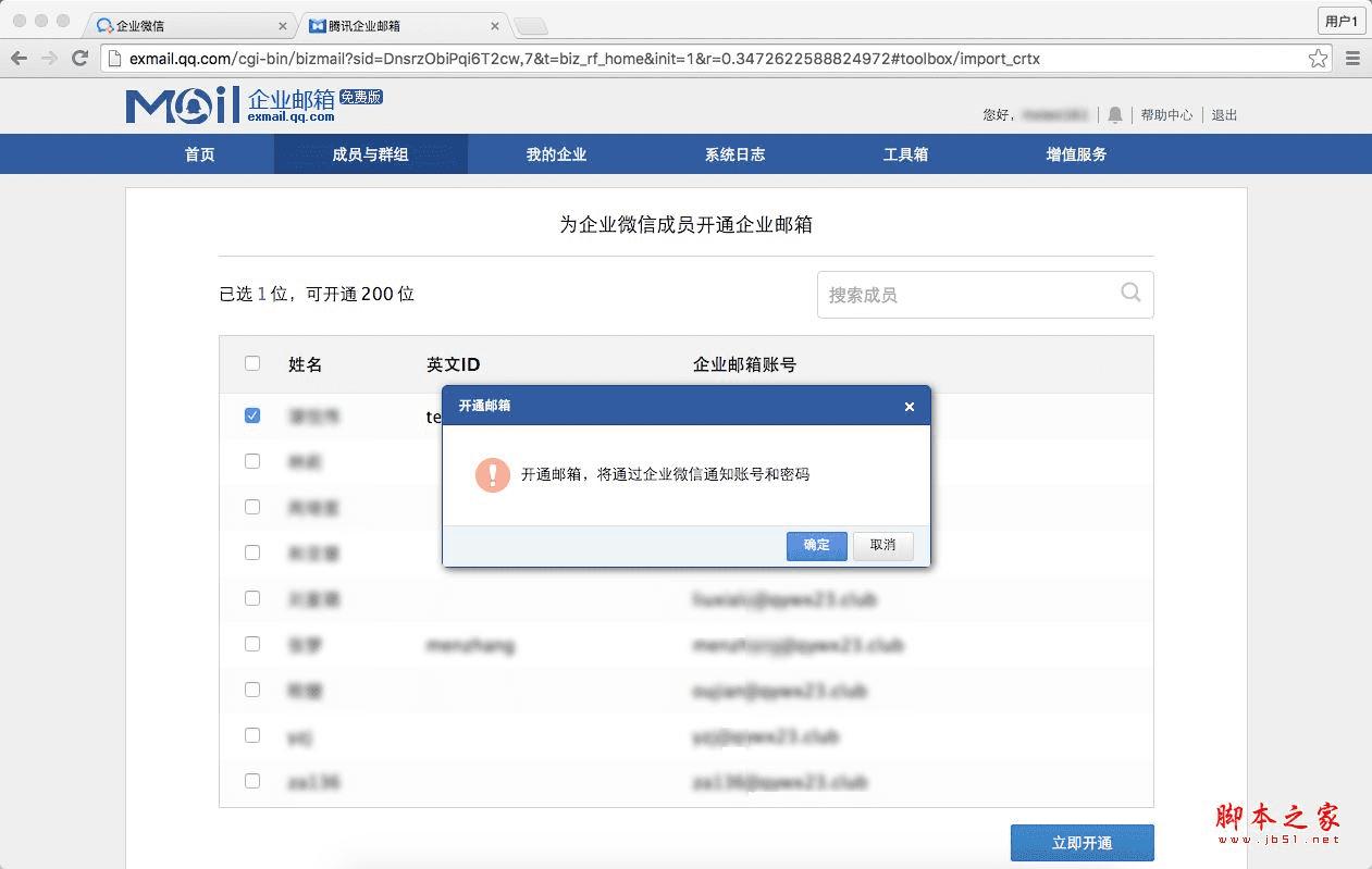 3)选帐号并开通后,会通过企业微信通过企业邮箱的帐号和密码;