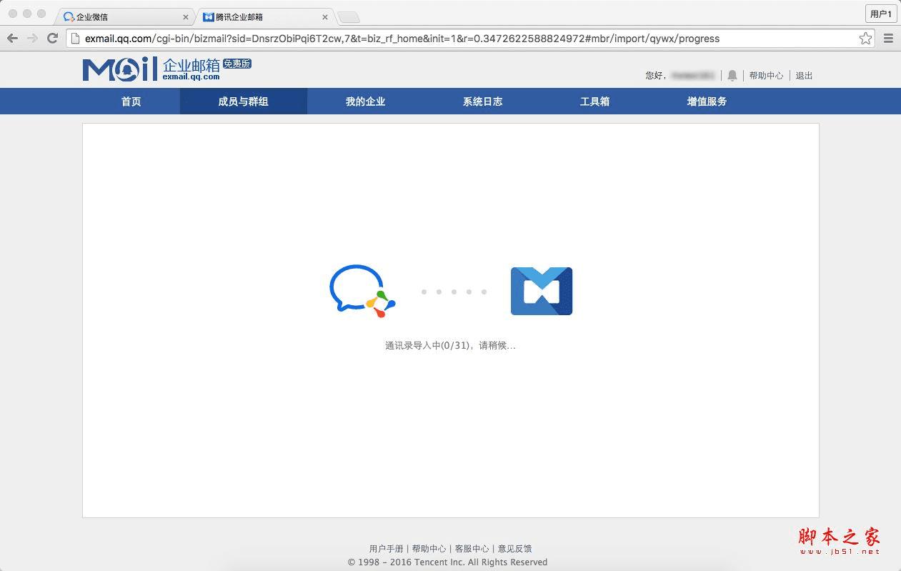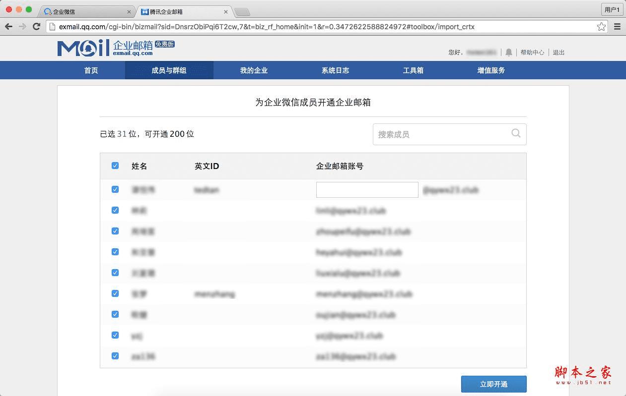 企业微信的全部通讯录都导入到腾讯企业邮箱中。