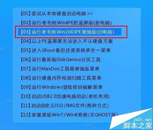 在主菜单界面用键盘方向键“↓”将光标移至“【03】运行老毛桃Win2003PE增强版(旧电脑)”,回车确定,如图所示: