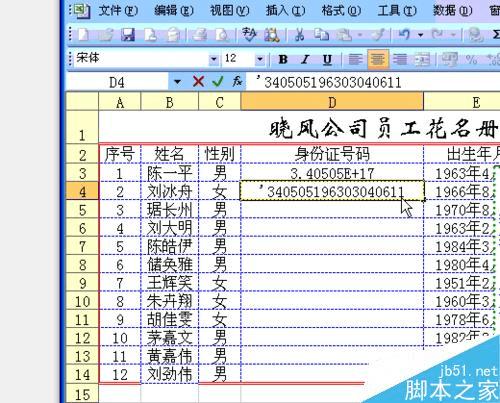 如图所示,在身份证号码下面的一行数字没有完全显示出来,而在第二行前面加一个'号,就可以显示12位数字了