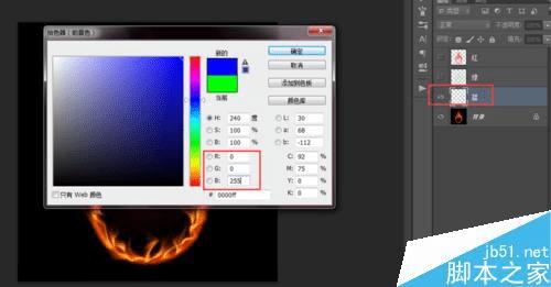 继续以同样的方式扣取蓝色通道的颜色。在蓝图层填充纯蓝色,RGB值为R0,,G0,B255。