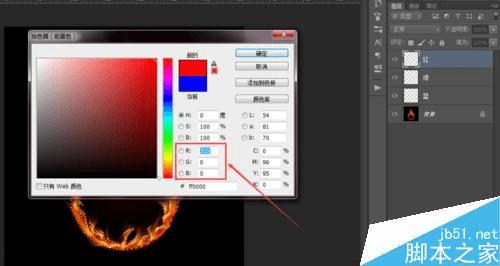 点击【编辑】,再【填充】,选择【颜色】,选择纯红色,RGB如图显示为R255,G0,B0。确定好之后即可填充到红图层。
