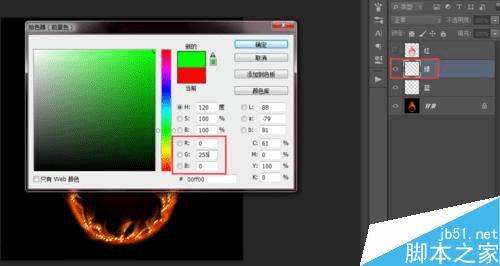 在绿图层填充纯绿色,RGB值为:R0,G255,B0。