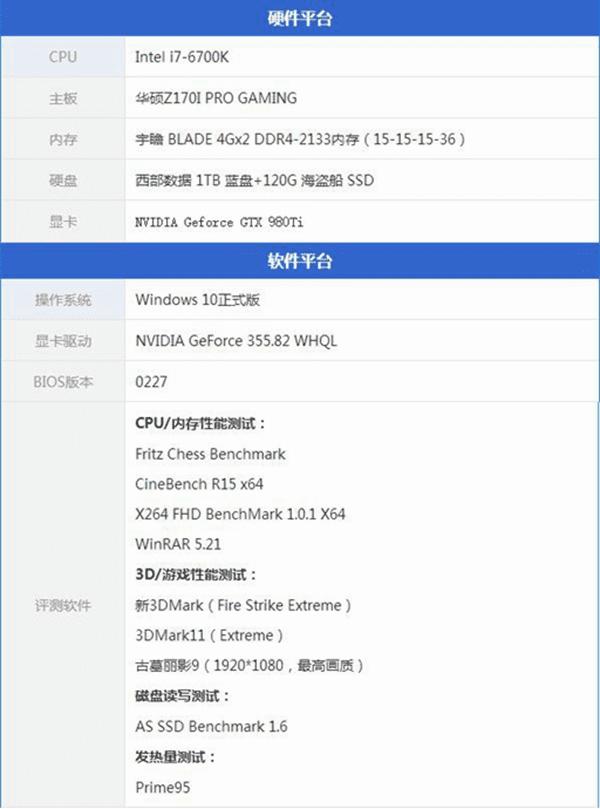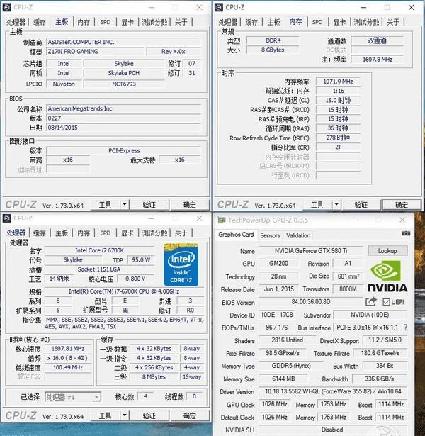 我们测试选择的硬件是Inteli7-6700K、公版GTX 980Ti和宇瞻 BLADE 4Gx2 DDR4-2133双通道内存, 我们会加入其它主板在这套硬件上的测试成绩作对比。在CPU-Z的截图中我们也可以看到主板使用的芯片组为Z170,型号为华硕Z170I PRO GAMING。