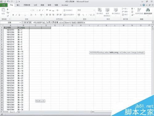 如图,在5月份表里位置输入公式:=VLOOKUP(A2,[4月人员名单.xlsx]Sheet1!$A$2:$B$5515,2,0)