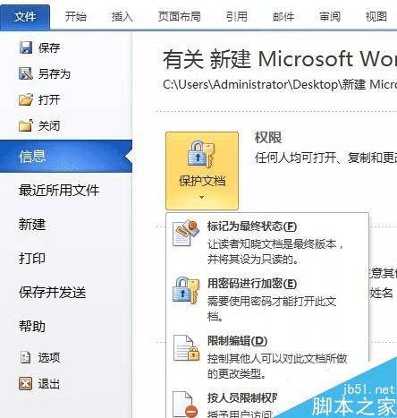 点击Word菜单栏的“文档”→“信息”→“保护文档”