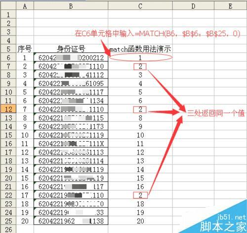 我们这里介绍一种利用函数标记重复数据的方法,首先我们需要掌握match和row两个函数的用法。先来看MATCH函数的用法,如下图所示,在C6单元格中输入=MATCH(B6,$B$6:$B$25,0),然后下拉填充至B25,效果如图所示。