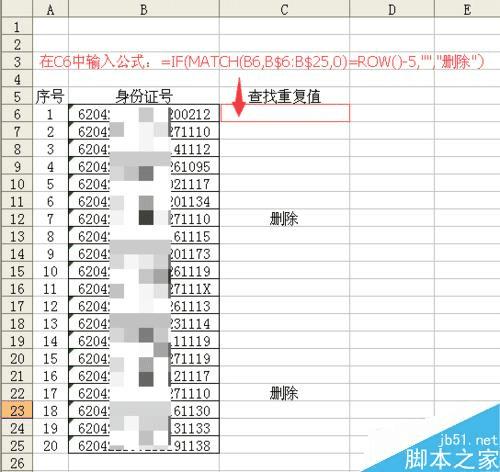 从上面的分析可以看出,MATCH函数的返回值和ROW函数的返回值有一定的规律,即MATCH函数的返回值等于row函数的返回值减去5。这样我们就找出了查找重复值的思路:如果“MATCH函数的返回值”不等于“ROW函数的返回值减去5”就说明该行重复了。找出重复值以后删除C列中显示“删除”标记的行,这样我们就去掉了表格中的重复内容。
