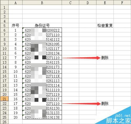 如下图所示,我们可以看到B7、B12、B22中的内容重复了,一般情况下需要我们删除第12行和第22行。