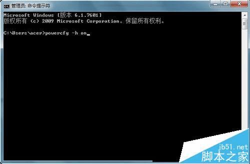 4、开启休眠功能:在cmd 命令窗口中输入 powercfg -h on ,就能开启休眠功能。