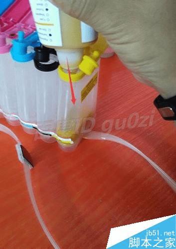 将墨水注入外置墨水仓,建议用点力气,但不要用太大的力,避免产生大量的气泡