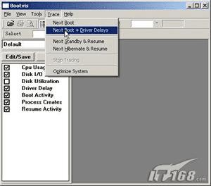 5.重起完成后,在开始 程序 启动里多了个BootVis命令,BootBis会自动开始、分析和记录你的系统起动过程。然后从菜单栏里选择轨迹(trace),选择定制化系统。