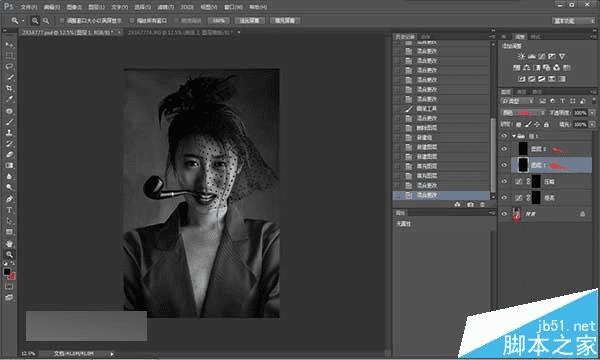 这样一来,照片就变成了高对比的黑白图像,方便在修图过程中观察。在完成双曲线之后可以删除观察组。