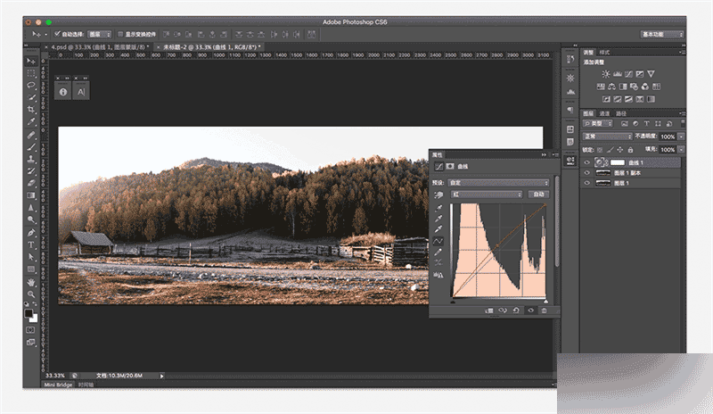 3,提升"红"曲线,降低"蓝"曲线。给图像一个暖色的主色调,营造阳光的感觉: