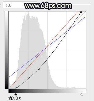 3、按Ctrl + Alt + 2 调出高光选区,按Ctrl + Shift + I 反选得到暗部选区,然后创建曲线调整图层,对RGB、红、蓝通道进行调整,参数及效果如下图。这一步把图片暗部大幅压暗,并增加暗蓝色和淡红色。